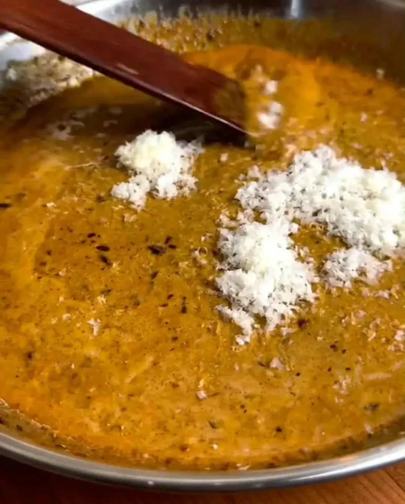 - Build the sauce: Once onions are golden, add garlic and seasonings. Stir for 1 minute, then mix in the chili crisp. Pour in the cream (or coconut milk) and simmer until smooth and slightly thickened. Add Parmesan and stir until melted.