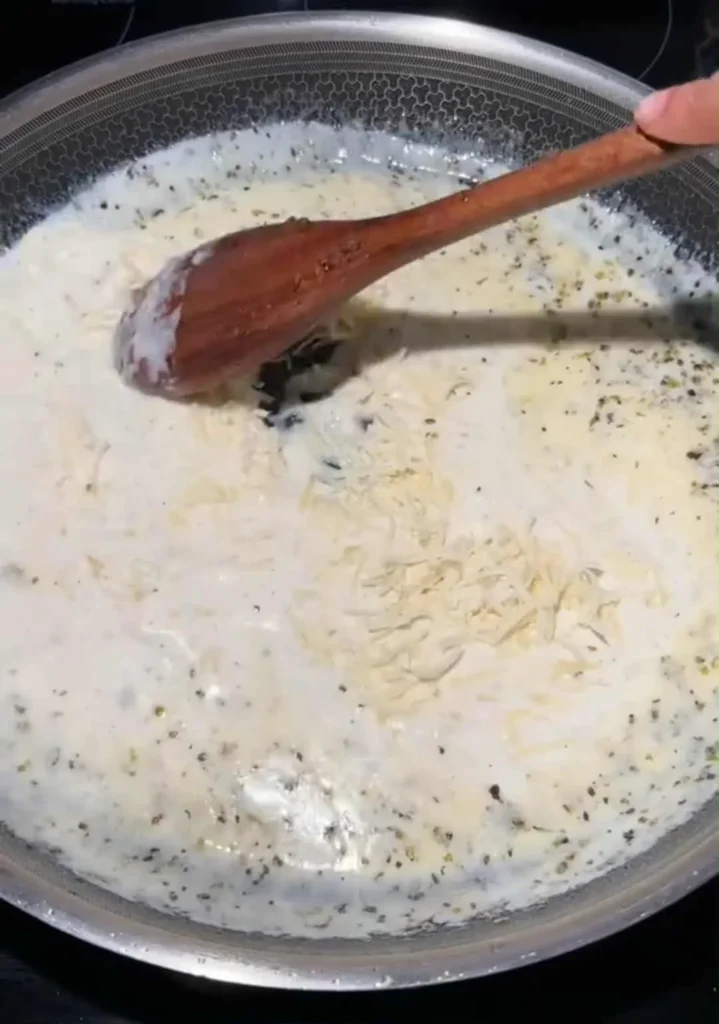 - Add heavy cream, then whisk in Parmesan + mozzarella until smooth and creamy.