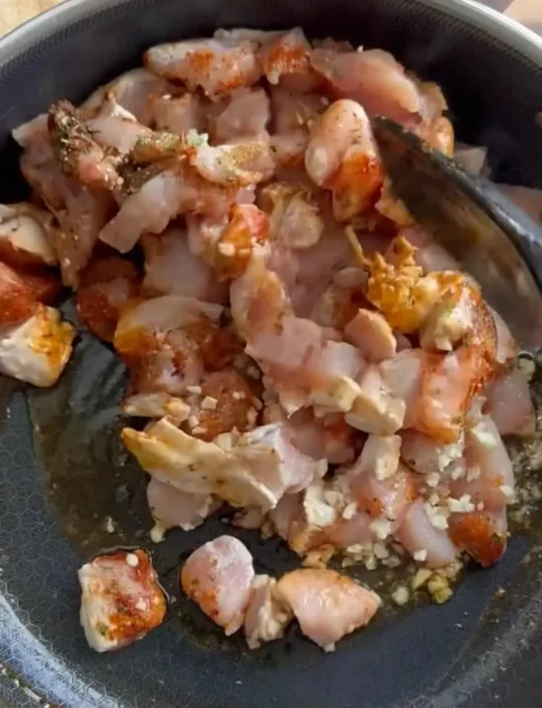 - Cook the chicken: In a large pan, heat oil over medium heat. Add chicken, garlic, and all the spices. Cook for 5 minutes until the chicken starts to brown.