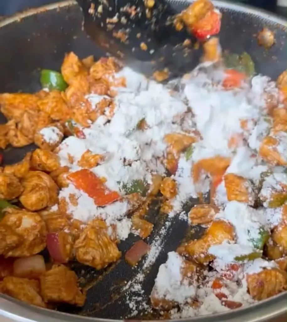- Make the sauce: Sprinkle flour over the mixture, stir well, and cook for 2–3 minutes to remove the raw flour taste. Gradually pour in the stock while stirring until thickened (4–5 minutes).