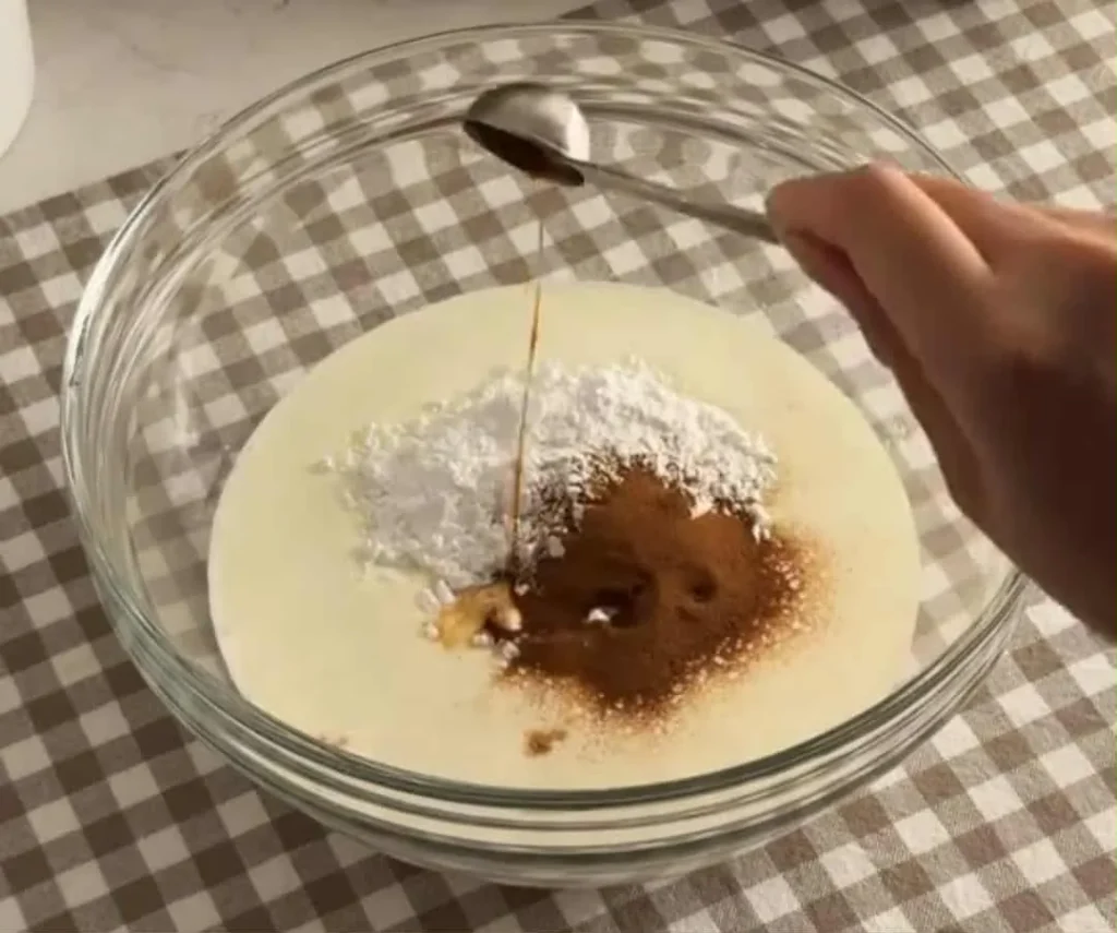 - In a large bowl, combine cold whipping cream, powdered sugar, espresso powder, and vanilla extract.