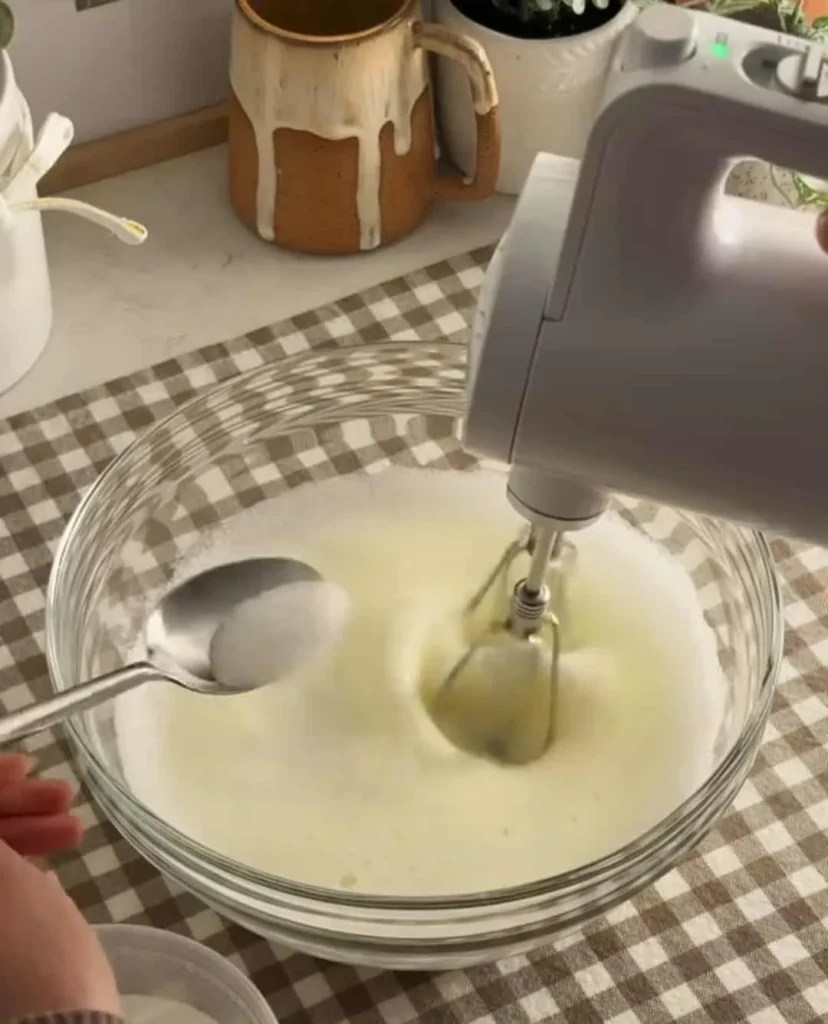- Make the meringue: Add cream of tartar to the egg whites. Beat until frothy, then gradually add 100 g sugar. Continue mixing until stiff peaks form.