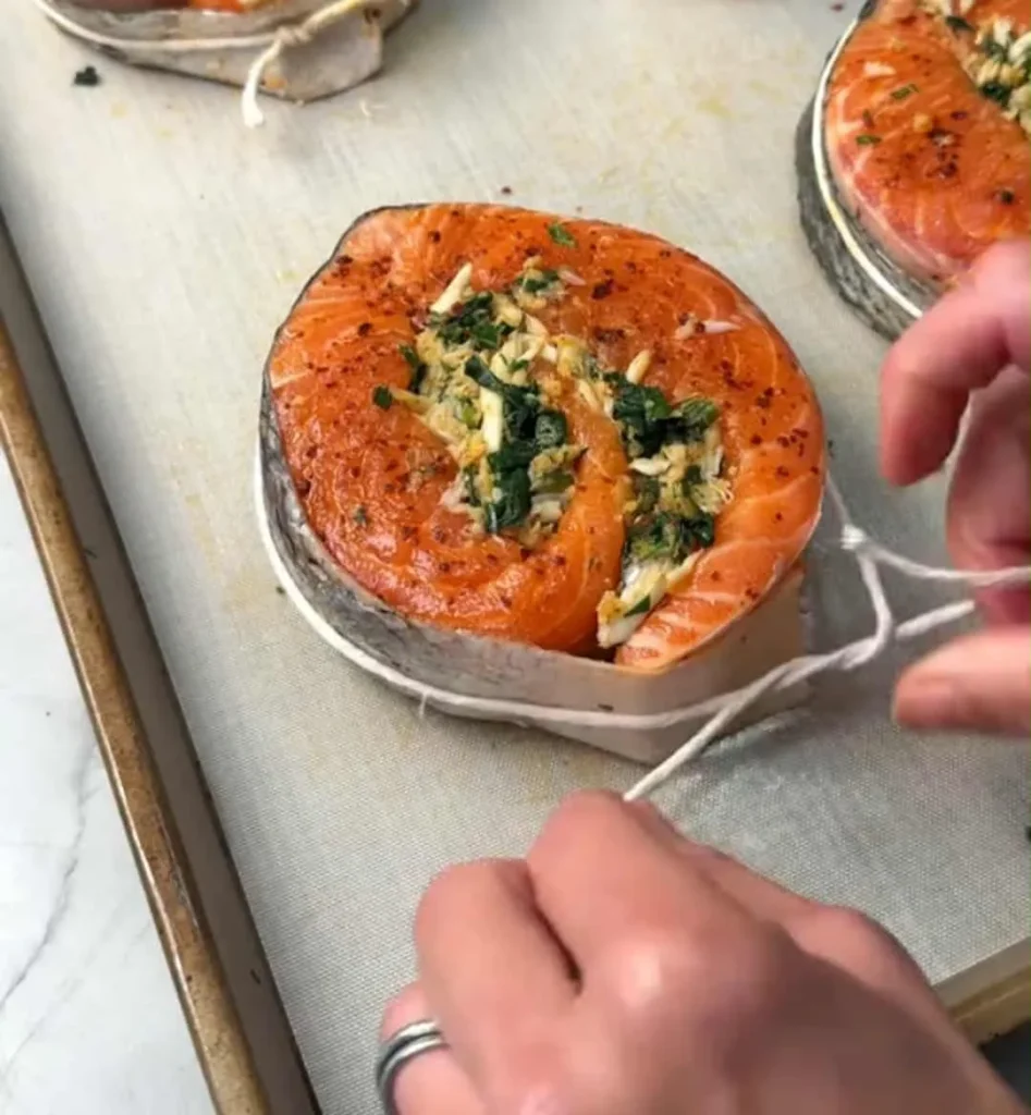 - Skipping the twine — this step helps the salmon keep its round shape during baking.