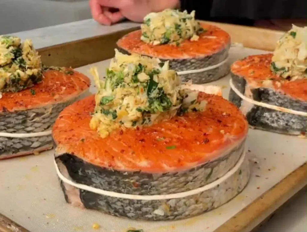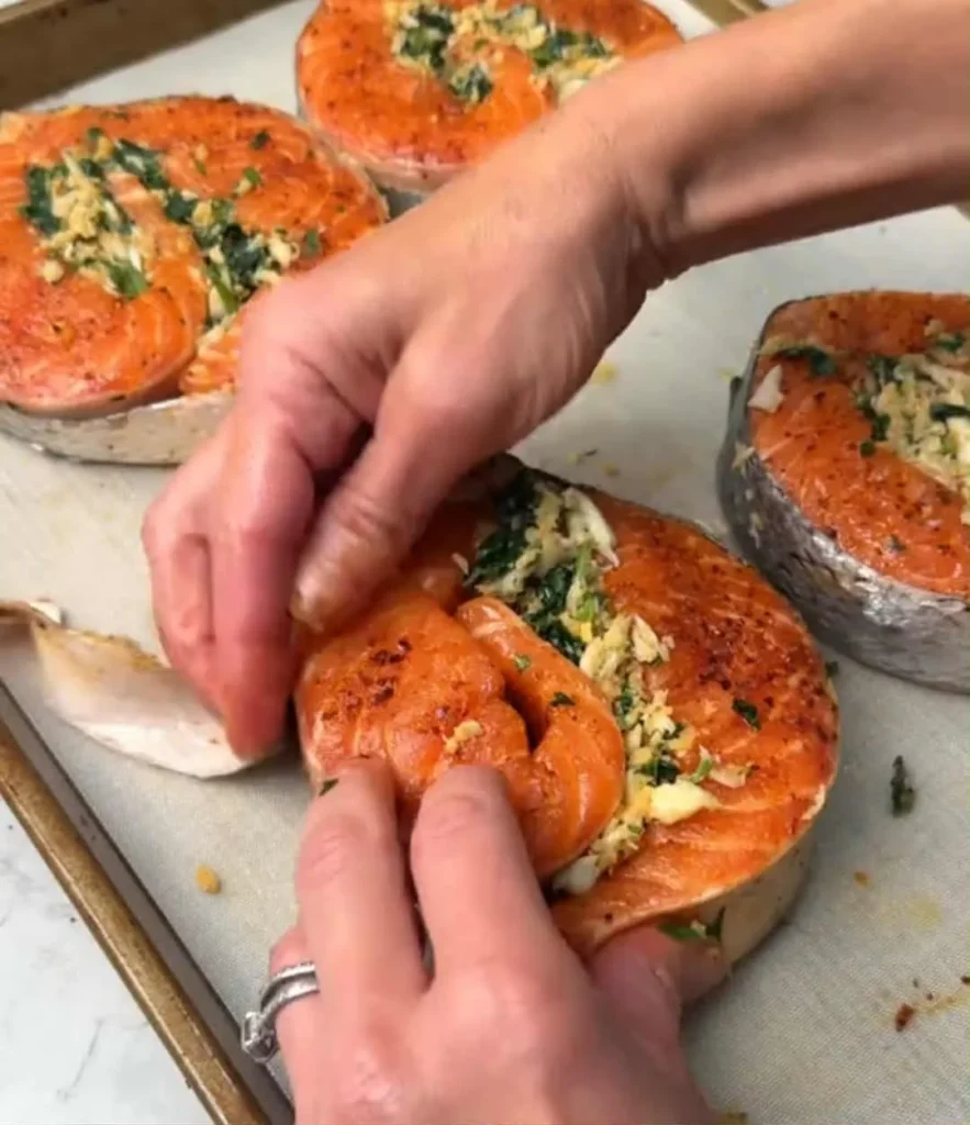 - Lay out each salmon steak flat. Spread about 1 tablespoon of the crab mixture onto the belly flap with the attached skin.