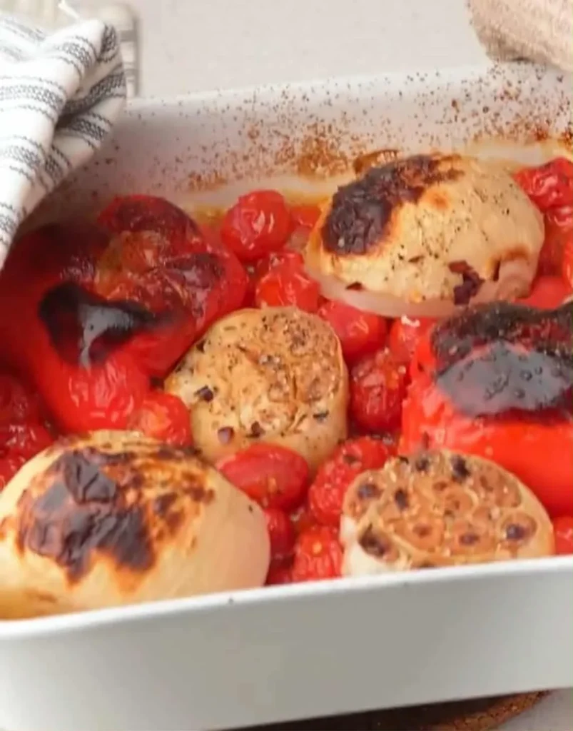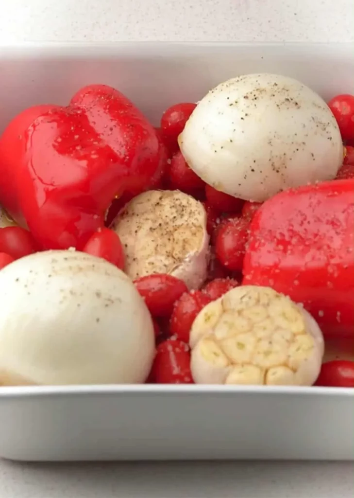 - In a baking dish, combine cherry tomatoes, garlic heads, onion, red pepper, olive oil, chilli flakes, salt, and pepper.