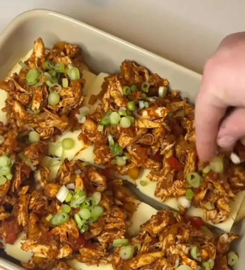 - Add mozzarella slices, the chicken mixture, spring onions, nacho cheese sauce, and jalapeños.