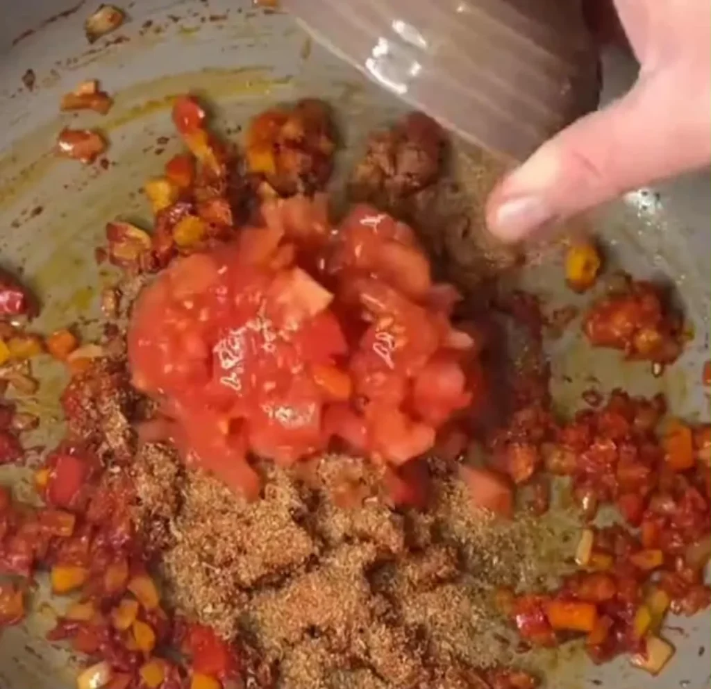 - Simmer the Sauce Base: Stir in tomato puree, paprika, cumin, oregano, cayenne, garlic, onion powder, and water. Add chopped tomatoes and simmer for 3–4 minutes until thickened.