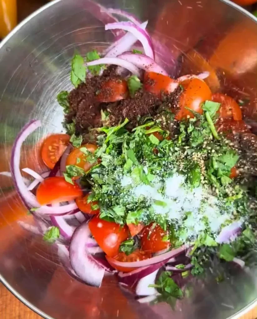 • In a bowl, combine red onion, cherry tomatoes, parsley, salt, pepper, sumac, and lemon juice.